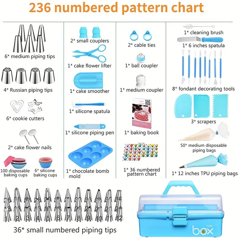 Elevate every baking moment with this beautifully complete 236‑Piece Piping Set, thoughtfully curated for beginners, hobby bakers, and seasoned decorators. Inside, you’ll find everything needed to create stunning cakes, cupcakes, cookies, and pastries—from versatile piping bags and precision‑cut tips to scrapers, biscuit molds, cake cups, and more.