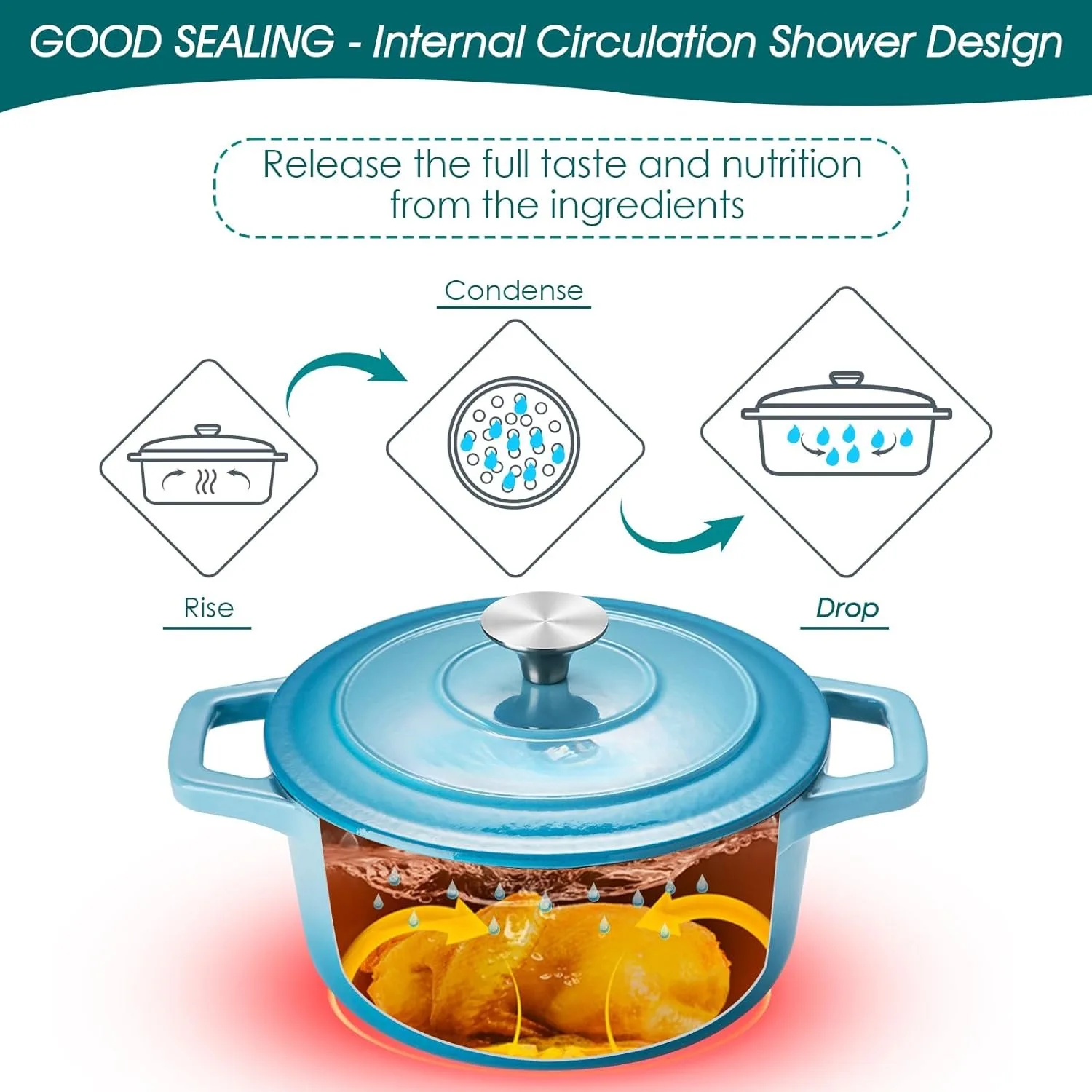 The uniform cast iron body ensures steady, even heat distribution, helping your recipes cook consistently from edge to center. Even after you remove the pot from the heat source, it retains warmth beautifully — a thoughtful touch when you’re waiting for guests or serving at the table. The stainless steel knob and self‑basting lid feature 40 raised condensation points that return moisture evenly, enhancing tenderness and flavor in every dish.